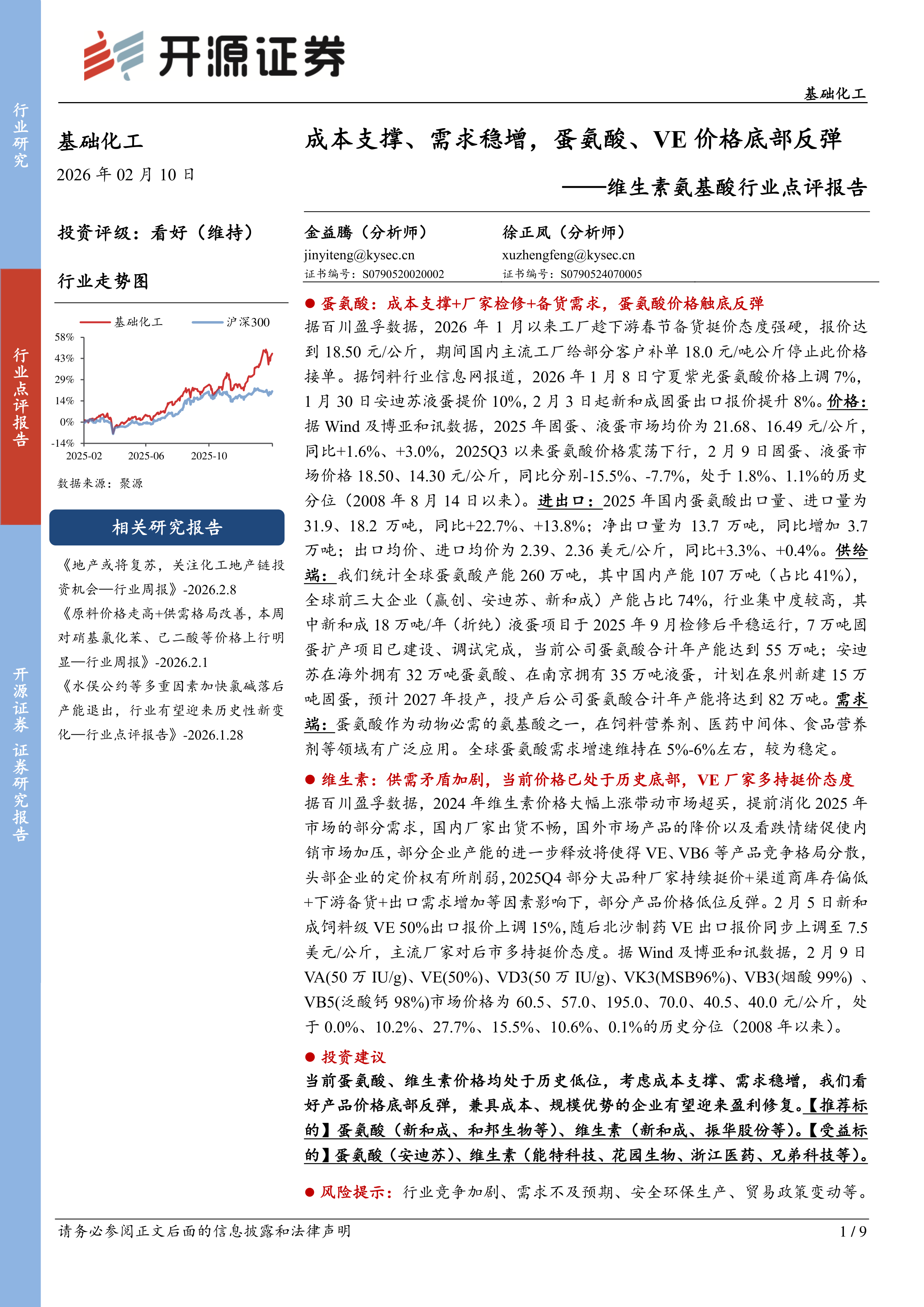 据百川盈孚数据,2026年1月以来工厂趁下游春节备货挺价态度强硬,报价达到18.50元/公斤,期间国内主流工厂给部分客户补单18.0元/吨公斤停止此价格接单。据饲料行业信息网报道,2026年1月8日宁夏紫光蛋氨酸价格上调7%,1月30日安迪苏液蛋提价10%,2月3日起新和成固蛋出口报价提升8%。价格:据Wind及博亚和讯数据,2025年固蛋、液蛋市场均价为21.68、16.49元/公斤,同比+1.6%、+3.0%,2025Q3以来蛋氨酸价格震荡下行,2月9日固蛋、液蛋市场价格18.50、14.30元/公斤,同比分别-15.5%、-7.7%,处于1.8%、1.1%的历史分位(2008年8月14日以来)。进出口:2025年国内蛋氨酸出口量、进口量为31.9、18.2万吨,同比+22.7%、+13.8%;净出口量为13.7万吨,同比增加3.7万吨;出口均价、进口均价为2.39、2.36美元/公斤,同比+3.3%、+0.4%。供给端:我们统计全球蛋氨酸产能260万吨,其中国内产能107万吨(占比41%),全球前三大企业(赢创、安迪苏、新和成)产能占比74%,行业集中度较高,其中新和成18万吨/年(折纯)液蛋项目于2025年9月检修后平稳运行,7万吨固蛋扩产项目已建设、调试完成,当前公司蛋氨酸合计年产能达到55万吨;安迪苏在海外拥有32万吨蛋氨酸、在南京拥有35万吨液蛋,计划在泉州新建15万吨固蛋,预计2027年投产,投产后公司蛋氨酸合计年产能将达到82万吨。需求端:蛋氨酸作为动物必需的氨基酸之一,在饲料营养剂、医药中间体、食品营养剂等领域有广泛应用。全球蛋氨酸需求增速维持在5%-6%左右,较为稳定。