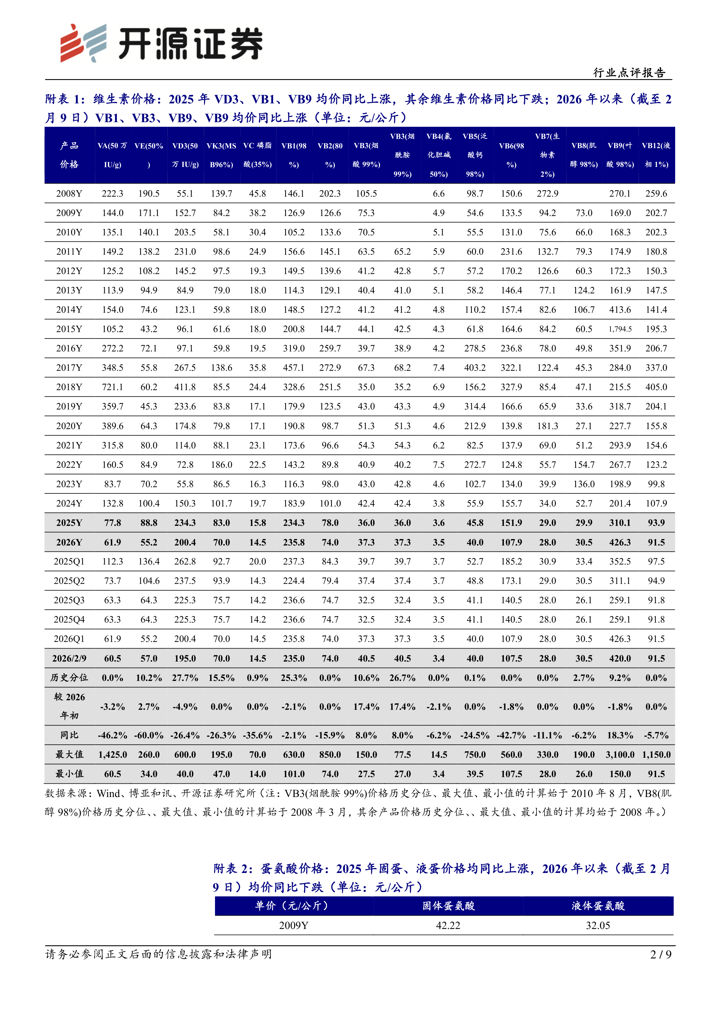 据百川盈孚数据,2024年维生素价格大幅上涨带动市场超买,提前消化2025年市场的部分需求,国内厂家出货不畅,国外市场产品的降价以及看跌情绪促使内销市场加压,部分企业产能的进一步释放将使得VE、VB6等产品竞争格局分散,头部企业的定价权有所削弱,2025Q4部分大品种厂家持续挺价+渠道商库存偏低+下游备货+出口需求增加等因素影响下,部分产品价格低位反弹。2月5日新和成饲料级VE50%出口报价上调15%,随后北沙制药VE出口报价同步上调至7.5美元/公斤,主流厂家对后市多持挺价态度。据Wind及博亚和讯数据,2月9日VA(50万IU/g)、VE(50%)、VD3(50万IU/g)、VK3(MSB96%)、VB3(烟酸99%)、VB5(泛酸钙98%)市场价格为60.5、57.0、195.0、70.0、40.5、40.0元/公斤,处于0.0%、10.2%、27.7%、15.5%、10.6%、0.1%的历史分位(2008年以来)。
