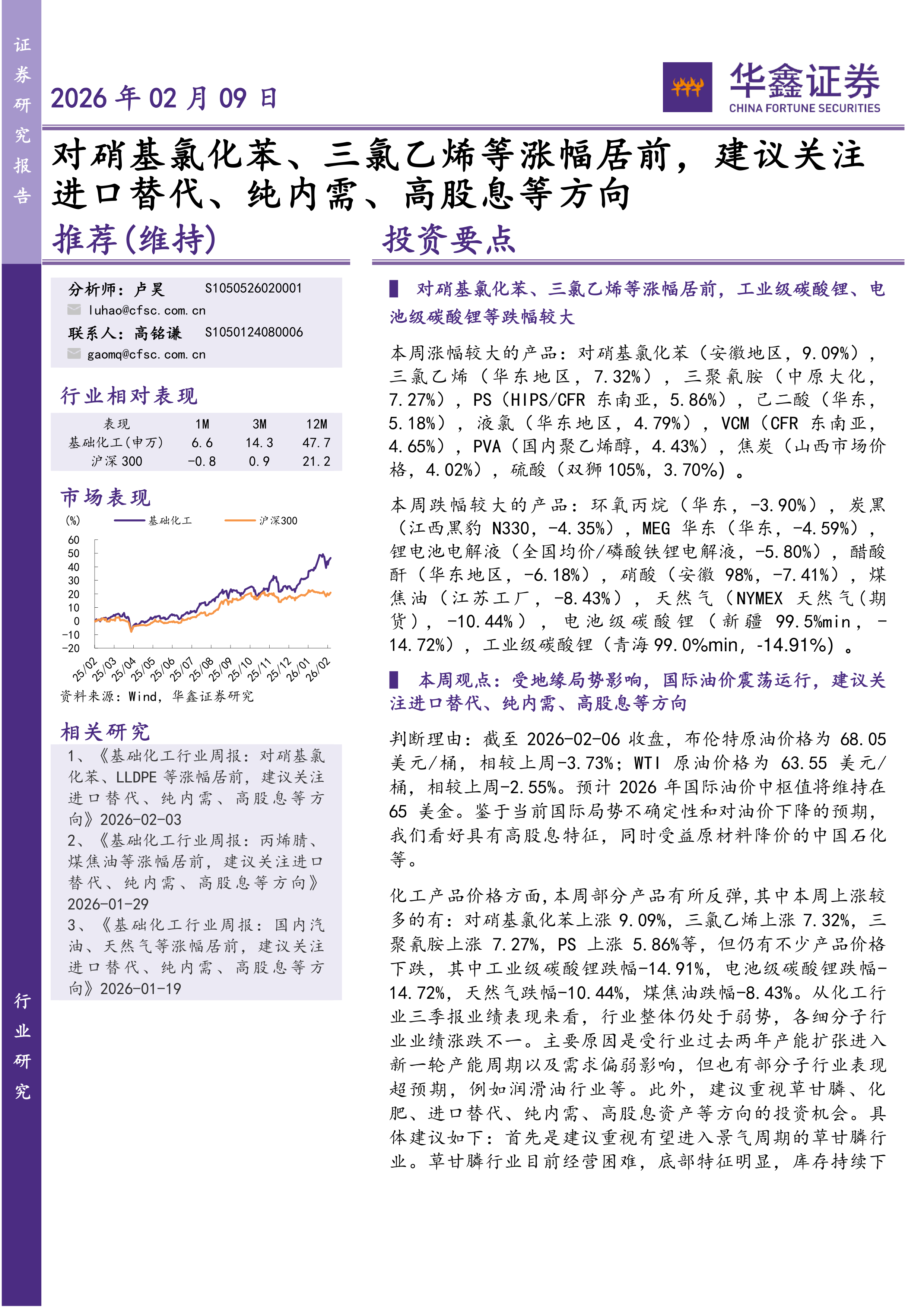 判断理由:截至2026-02-06收盘,布伦特原油价格为68.05美元/桶,相较上周-3.73%;WTI原油价格为63.55美元/桶,相较上周-2.55%。预计2026年国际油价中枢值将维持在65美金。鉴于当前国际局势不确定性和对油价下降的预期,我们看好具有高股息特征,同时受益原材料降价的中国石化等。