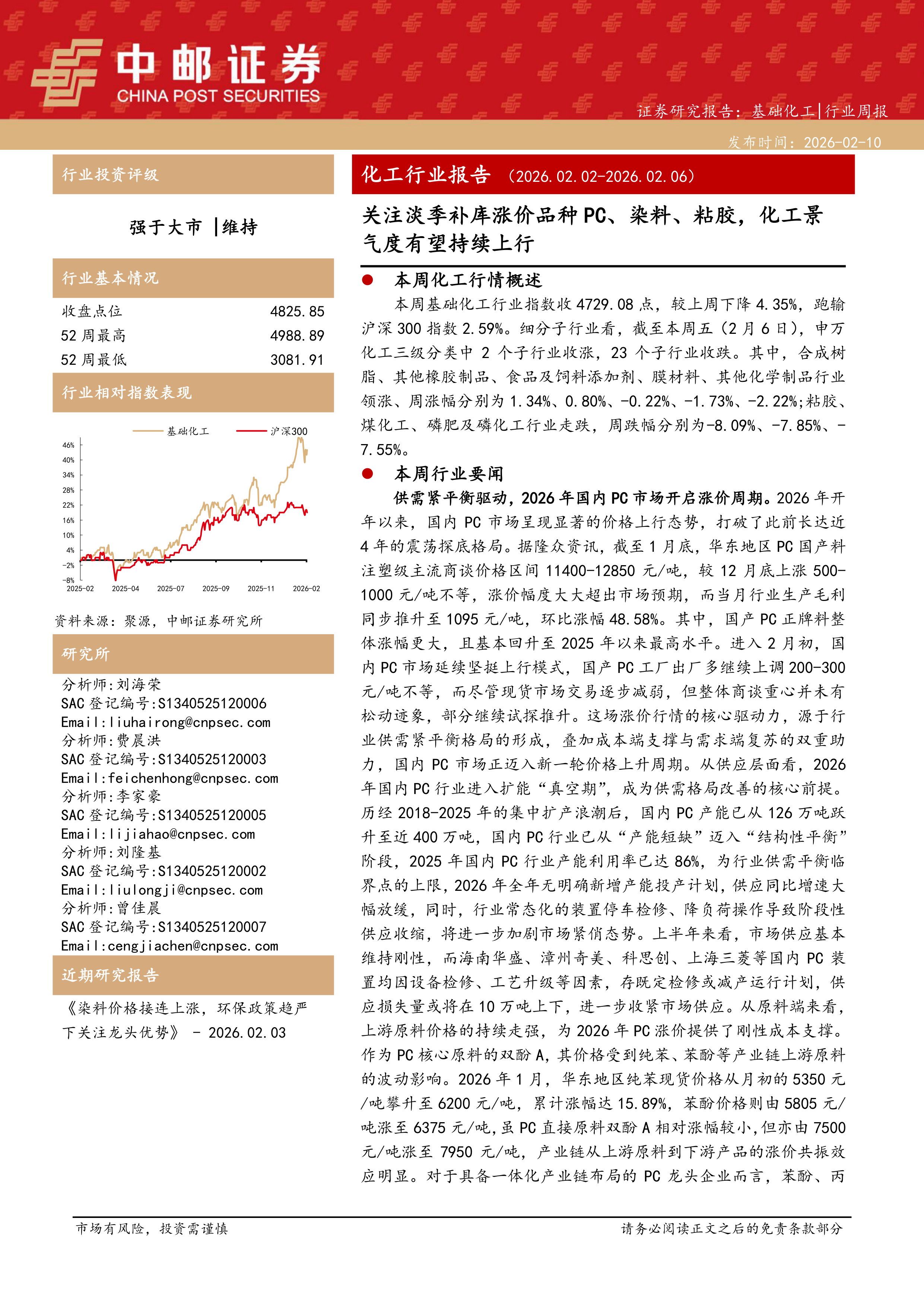 供需紧平衡驱动,2026年国内PC市场开启涨价周期。2026年开年以来,国内PC市场呈现显著的价格上行态势,打破了此前长达近4年的震荡探底格局。据隆众资讯,截至1月底,华东地区PC国产料注塑级主流商谈价格区间11400-12850元/吨,较12月底上涨500-1000元/吨不等,涨价幅度大大超出市场预期,而当月行业生产毛利同步推升至1095元/吨,环比涨幅48.58%。其中,国产PC正牌料整体涨幅更大,且基本回升至2025年以来最高水平。进入2月初,国内PC市场延续坚挺上行模式,国产PC工厂出厂多继续上调200-300元/吨不等,而尽管现货市场交易逐步减弱,但整体商谈重心并未有松动迹象,部分继续试探推升。这场涨价行情的核心驱动力,源于行业供需紧平衡格局的形成,叠加成本端支撑与需求端复苏的双重助力,国内PC市场正迈入新一轮价格上升周期。从供应层面看,2026年国内PC行业进入扩能“真空期”,成为供需格局改善的核心前提。历经2018-2025年的集中扩产浪潮后,国内PC产能已从126万吨跃升至近400万吨,国内PC行业已从“产能短缺”迈入“结构性平衡阶段,2025年国内PC行业产能利用率已达86%,为行业供需平衡临界点的上限,2026年全年无明确新增产能投产计划,供应同比增速大幅放缓,同时,行业常态化的装置停车检修、降负荷操作导致阶段性供应收缩,将进一步加剧市场紧俏态势。上半年来看,市场供应基本维持刚性,而海南华盛、漳州奇美、科思创、上海三菱等国内PC装置均因设备检修、工艺升级等因素,存既定检修或减产运行计划,供应损失量或将在10万吨上下,进一步收紧市场供应。从原料端来看上游原料价格的持续走强,为2026年PC涨价提供了刚性成本支撑。作为PC核心原料的双酚A,其价格受到纯苯、苯酚等产业链上游原料的波动影响。2026年1月,华东地区纯苯现货价格从月初的5350元/吨攀升至6200元/吨,累计涨幅达15.89%,苯酚价格则由5805元/吨涨至6375元/吨,虽PC直接原料双酚A相对涨幅较小,但亦由7500元/吨涨至7950元/吨,产业链从上游原料到下游产品的涨价共振效应明显。对于具备一体化产业链布局的PC龙头企业而言,苯酚、丙酮等关键原料的内部自供能力有效锁定了成本空间,但行业整体仍受原料价格波动的直接影响。产业链成本端共振,进一步强化了PC涨价逻辑的合理性与持续性。