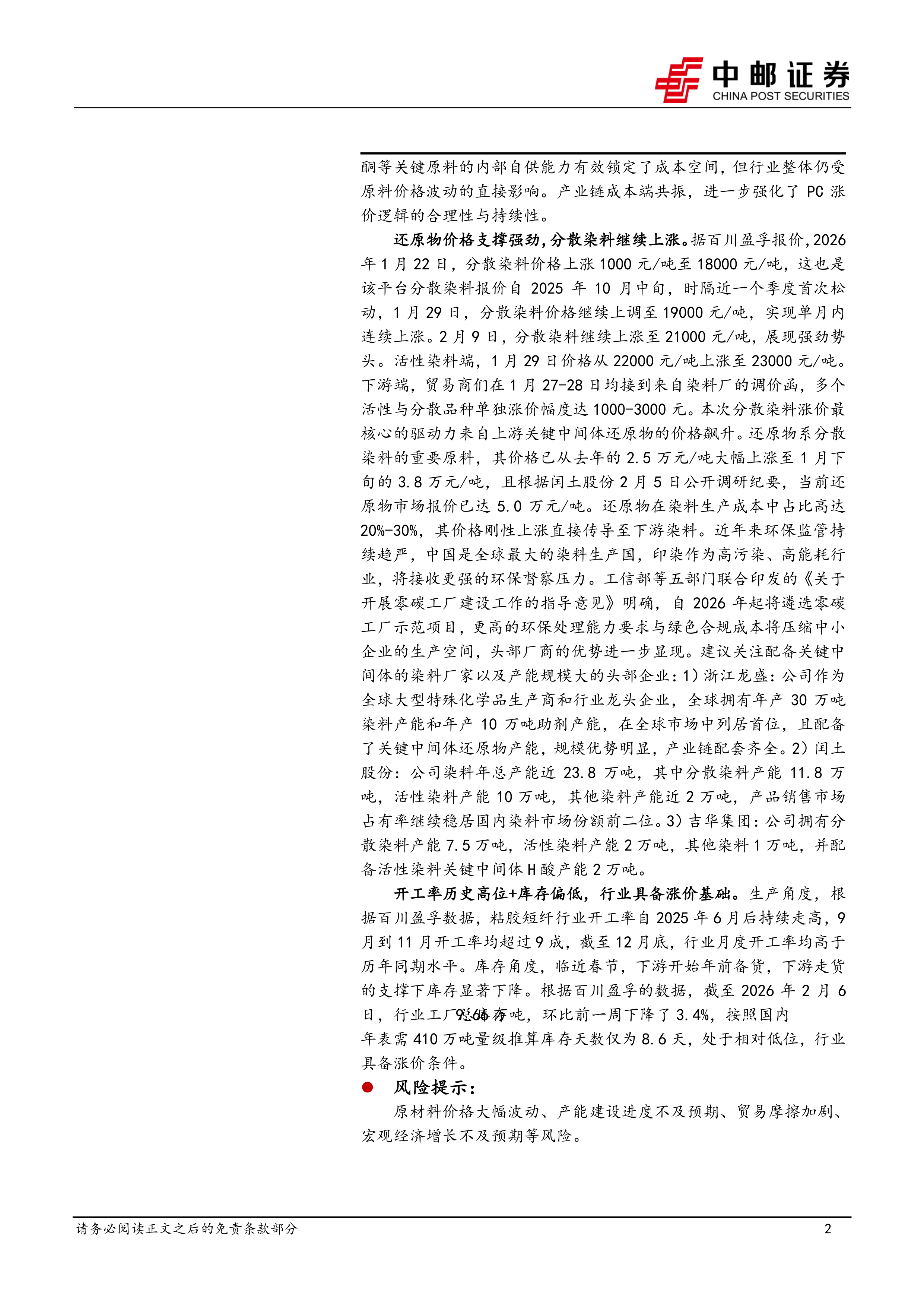 还原物价格支撑强劲,分散染料继续上涨。据百川盈孚报价,2026年1月22日,分散染料价格上涨1000元/吨至18000元/吨,这也是该平台分散染料报价自2025年10月中旬,时隔近一个季度首次松动,1月29日,分散染料价格继续上调至19000元/吨,实现单月内连续上涨。2月9日,分散染料继续上涨至21000元/吨,展现强劲势头。活性染料端,1月29日价格从22000元/吨上涨至23000元/吨。下游端,贸易商们在1月27-28日均接到来自染料厂的调价函,多个活性与分散品种单独涨价幅度达1000-3000元。本次分散染料涨价最核心的驱动力来自上游关键中间体还原物的价格飙升。还原物系分散染料的重要原料,其价格已从去年的2.5万元/吨大幅上涨至1月下旬的3.8万元/吨,且根据闰土股份2月5日公开调研纪要,当前还原物市场报价已达5.0万元/吨。还原物在染料生产成本中占比高达20%-30%,其价格刚性上涨直接传导至下游染料。近年来环保监管持续趋严,中国是全球最大的染料生产国,印染作为高污染、高能耗行业,将接收更强的环保督察压力。工信部等五部门联合印发的《关于开展零碳工厂建设工作的指导意见》明确,自2026年起将遴选零碳工厂示范项目,更高的环保处理能力要求与绿色合规成本将压缩中小企业的生产空间,头部厂商的优势进一步显现。建议关注配备关键中间体的染料厂家以及产能规模大的头部企业:1)浙江龙盛:公司作为全球大型特殊化学品生产商和行业龙头企业,全球拥有年产30万吨染料产能和年产10万吨助剂产能,在全球市场中列居首位,且配备了关键中间体还原物产能,规模优势明显,产业链配套齐全。2)闰土股份:公司染料年总产能近23.8万吨,其中分散染料产能11.8万吨,活性染料产能10万吨,其他染料产能近2万吨,产品销售市场占有率继续稳居国内染料市场份额前二位。3)吉华集团:公司拥有分散染料产能7.5万吨,活性染料产能2万吨,其他染料1万吨,并配备活性染料关键中间体H酸产能2万吨。