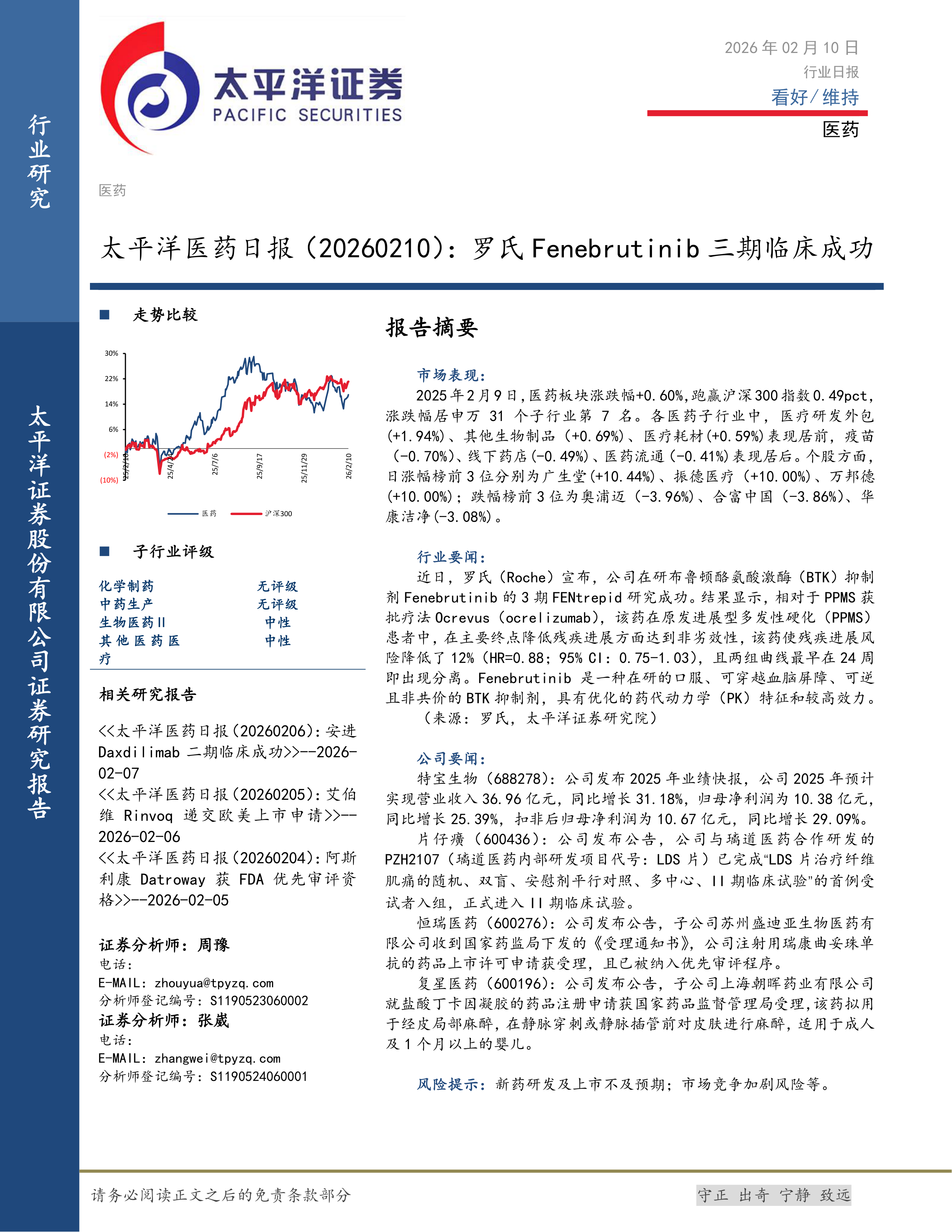 2025年2月9日,医药板块涨跌幅+0.60%,跑赢沪深300指数0.49pct,涨跌幅居申万31个子行业第7名。各医药子行业中,医疗研发外包(+1.94%)、其他生物制品(+0.69%)、医疗耗材(+0.59%)表现居前,疫苗(-0.70%)、线下药店(-0.49%)、医药流通(-0.41%)表现居后。个股方面,日涨幅榜前3位分别为广生堂(+10.44%)、振德医疗(+10.00%)、万邦德(+10.00%);跌幅榜前3位为奥浦迈(-3.96%)、合富中国(-3.86%)、华康洁净(-3.08%)。