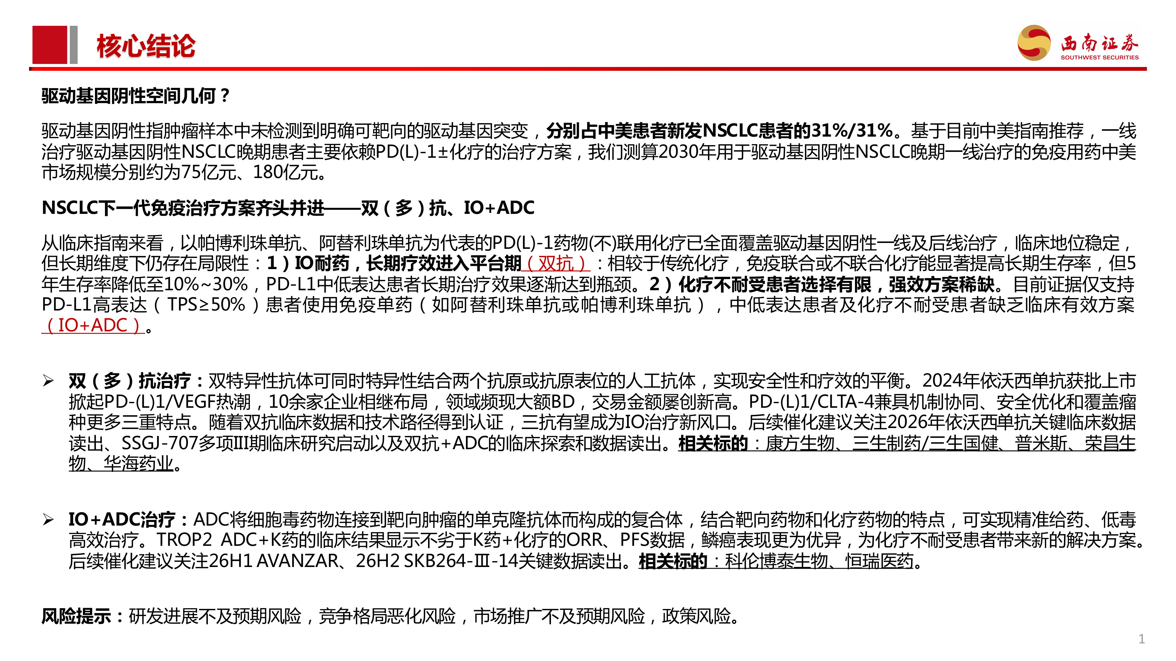 IO+ADC治疗:ADC将细胞毒药物连接到靶向肿瘤的单克隆抗体而构成的复合体,结合靶向药物和化疗药物的特点,可实现精准给药、低毒高效治疗。TROP2ADC+K药的临床结果显示不劣于K药+化疗的ORR、PFS数据,鳞癌表现更为优异,为化疗不耐受患者带来新的解决方案。后续催化建议关注26H1AVANZAR、26H2SKB264-Ⅲ-14关键数据读出。相关标的:科伦博泰生物、恒瑞医药。