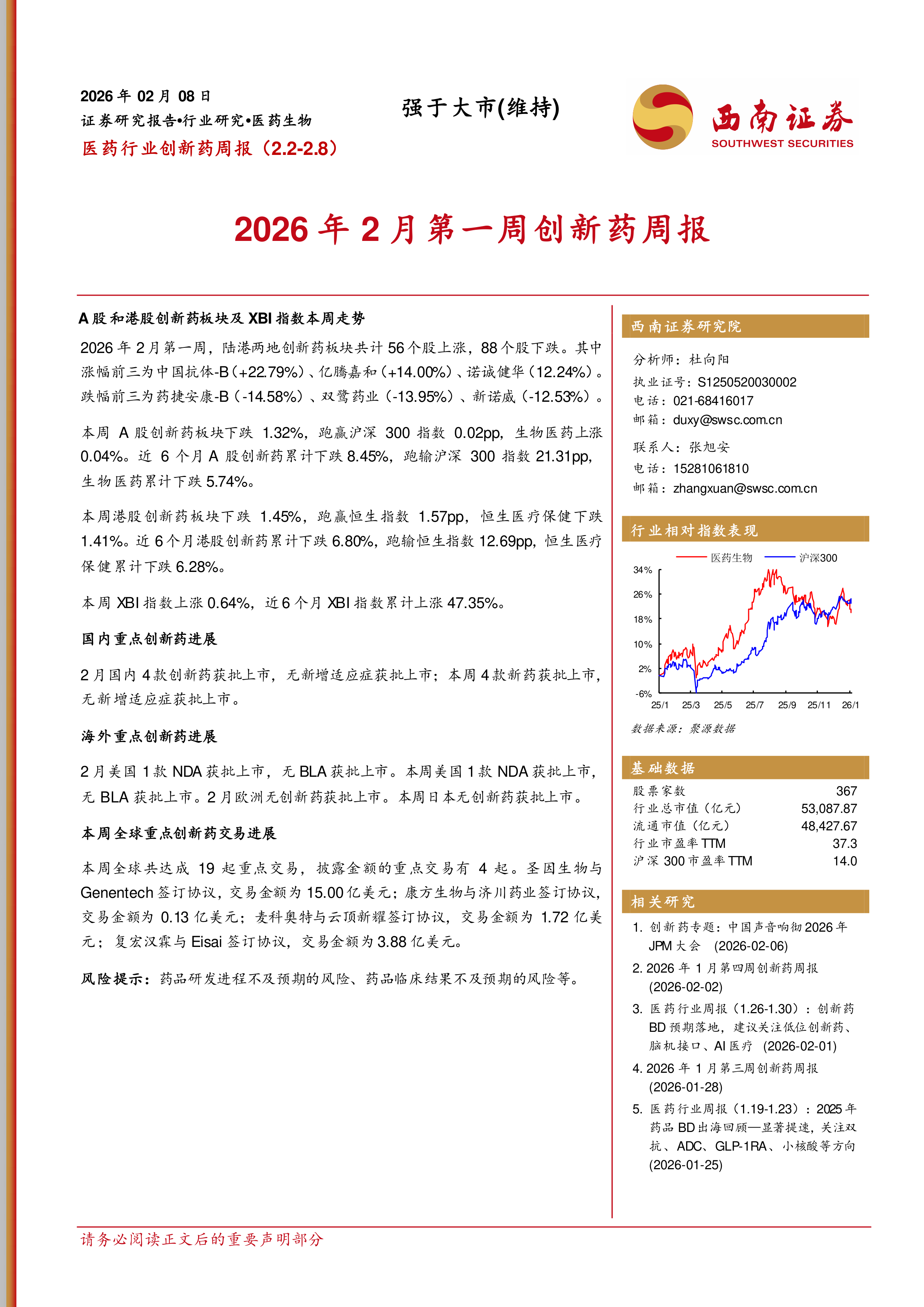 医药行业创新药周报:2026年2月第一周创新药周报