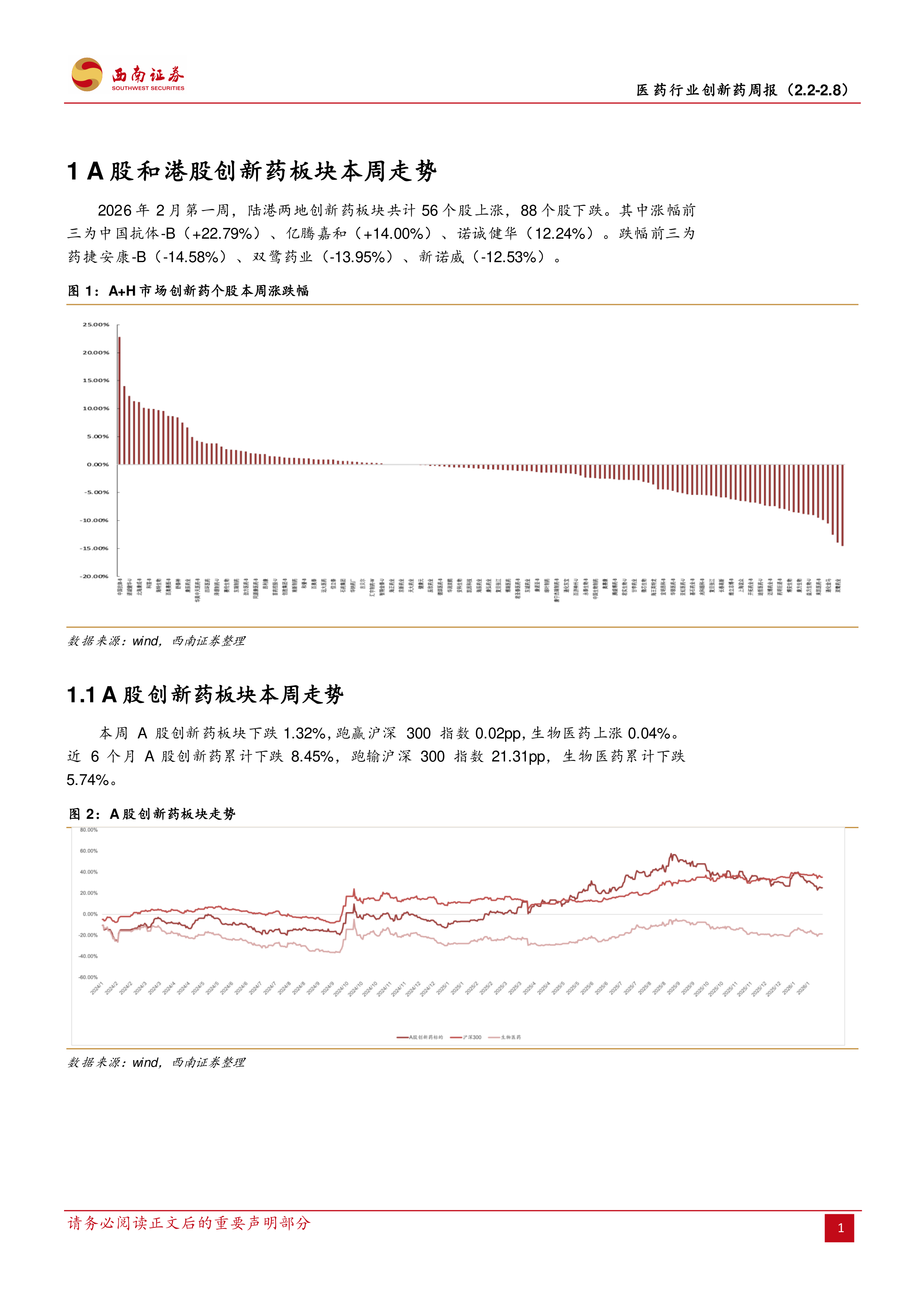 2026年2月第一周,陆港两地创新药板块共计56个股上涨,88个股下跌。其中涨幅前三为中国抗体-B(+22.79%)、亿腾嘉和(+14.00%)、诺诚健华(12.24%)。跌幅前三为药捷安康-B(-14.58%)、双鹭药业(-13.95%)、新诺威(-12.53%)。