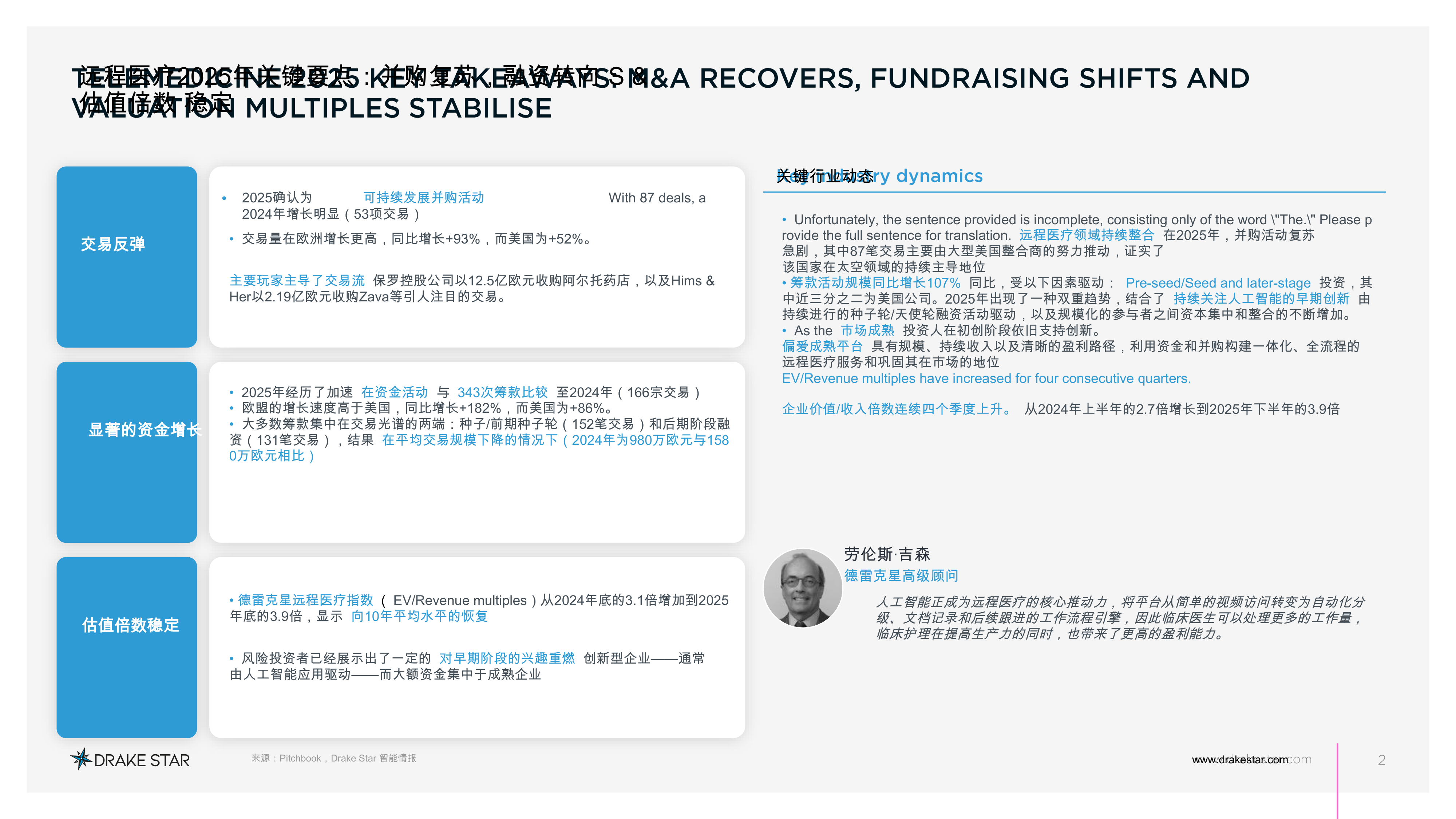 德雷克星远程医疗指数(EV/Revenue multiples)从2024年底的3.1倍增加到2025年底的3.9倍,显示向10年平均水平的恢复