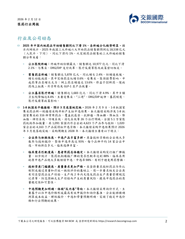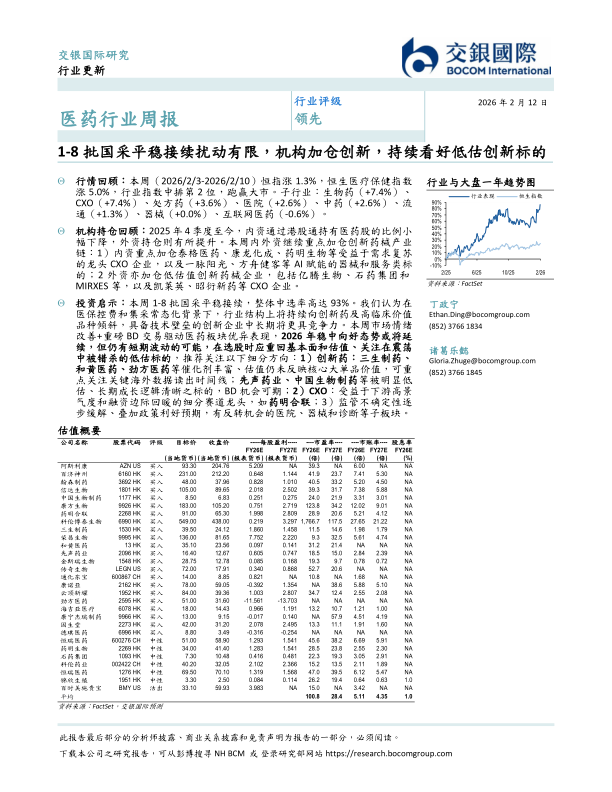 投资启示:本周1-8批国采平稳接续,整体中选率高达93%。我们认为在医保控费和集采常态化背景下,行业结构上将持续向创新药及高临床价值品种倾斜,具备技术壁垒的创新企业中长期将更具竞争力。本周市场情绪改善+重磅BD交易驱动医药板块优异表现,2026年稳中向好态势或将延续,但仍有短期波动的可能,在选股时应重回基本面和估值、关注在震荡中被错杀的低估标的,推荐关注以下细分方向:1)创新药:三生制药、和黄医药、劲方医药等催化剂丰富、估值仍未反映核心大单品价值,可重点关注关键海外数据读出时间线;先声药业、中国生物制药等被明显低估、长期成长逻辑清晰之标的,BD机会可期;2)CXO:受益于下游高景气度和融资边际回暖的细分赛道龙头,如药明合联;3)监管不确定性逐步缓解、叠加政策利好预期,有反转机会的医院、器械和诊断等子板块。