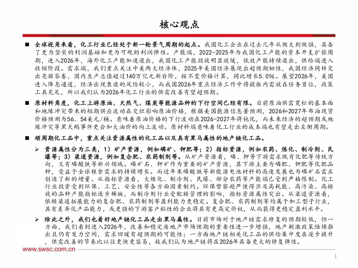 全球视角来看,化工行业已经处于新一轮景气周期的起点。我国化工企业在过去几年从做大到做强,具备了更为坚实的利润基础和更为可观的利润弹性。产能端,2022-2025年为我国化工产能的资本开支扩张周期,进入2026年,海外化工产能加速退出,我国化工产能投放明显放缓,低效产能持续退出,供给端进入收缩阶段。需求端,我们重点关注中美两大经济体,2025年美国经济展现出超预期韧性,我国经济同样交出亮丽答卷,国内生产总值超过140万亿元新台阶,按不变价格计算,同比增长5.0%。展望2026年,美国进入降息通道,经济出现衰退的风险较小,而我国2026年重点经济工作中将提振内需放在任务首位,政策工具充足,所以我们认为2026年化工行业的供需改善有望超预期。