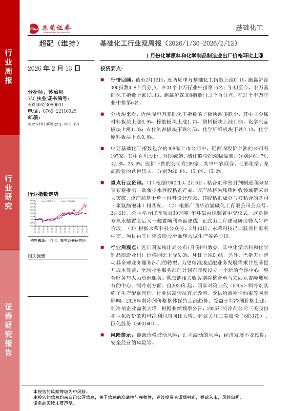 行业周观点:近日国家统计局公布1月份PPI数据,其中化学原料和化学制品制造业出厂价格同比下降5.0%,环比上涨0.6%。另外,巴斯夫正推动其全球业务服务部门的转型。为更精准地适配业务发展需求并显著提升成本效益,全球业务服务部门计划在印度设立一个新的全球中心,整合财务与人力资源服务;供应链相关服务则将整合至马来西亚吉隆坡现有的中心。制冷剂方面,自2024年起,国家对第三代(HFCs)制冷剂实施了生产配额管理,行业供需情况有所改善。受供给端刚性约束等因素影响,2025年制冷剂价格整体保持上涨趋势。受益于制冷剂价格上涨,制冷剂企业盈利大增,根据业绩预增公告,2025年制冷剂公司三美股份和巨化股份的归母净利润均同比大增。建议关注三美股份(603379)、巨化股份(600160)。