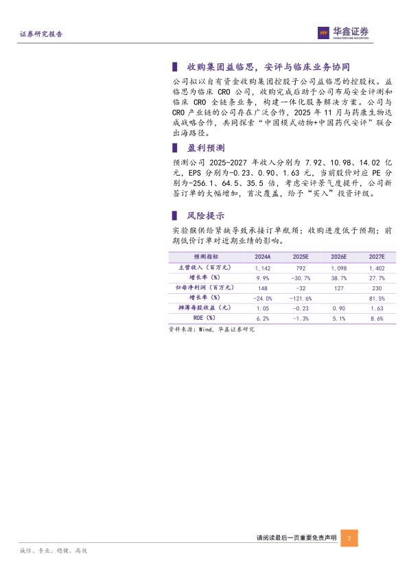 公司拟以自有资金收购集团控股子公司益临思的控股权。益临思为临床CRO公司,收购完成后助于公司布局安全评测和临床CRO全链条业务,构建一体化服务解决方案。公司与CRO产业链的公司存在广泛合作,2025年11月与药康生物达成战略合作,共同探索“中国模式动物+中国药代安评”联合出海路径。