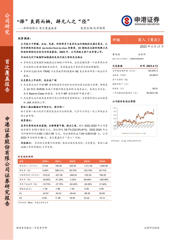 差异化管线迎来收获期,业绩增量可期,拐点已现。预计2022-2024年公司营收分别为3/10.1/16.3亿元,同比增长59.7%/232.8%/61%。2022-2024年公司归母净利润-4.66/-1.55/1.66亿元,对应每股收益-1.94/-0.65/0.69元。公司2023年目标价为84元,首次覆盖给予“买入”评级。