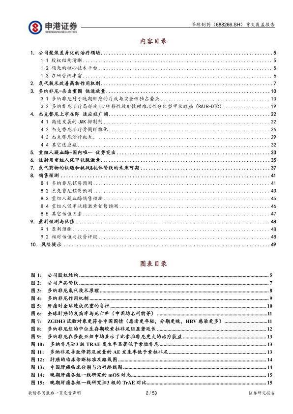 风险提示:多纳非尼销量不及预期;临床试验失败风险;杰克替尼,重组人凝血酶上市时间推迟/上市失败。