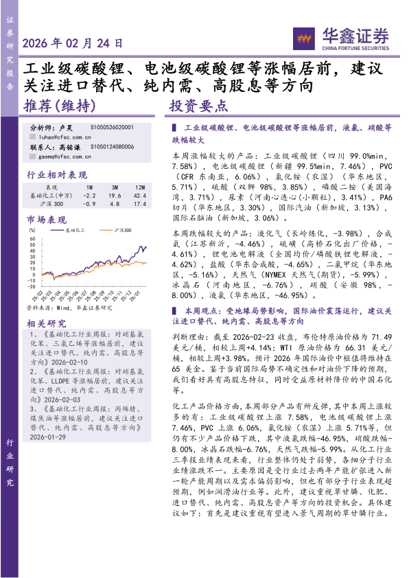 基础化工行业周报:工业级碳酸锂、电池级碳酸锂等涨幅居前,建议关注进口替代、纯内需、高股息等方向