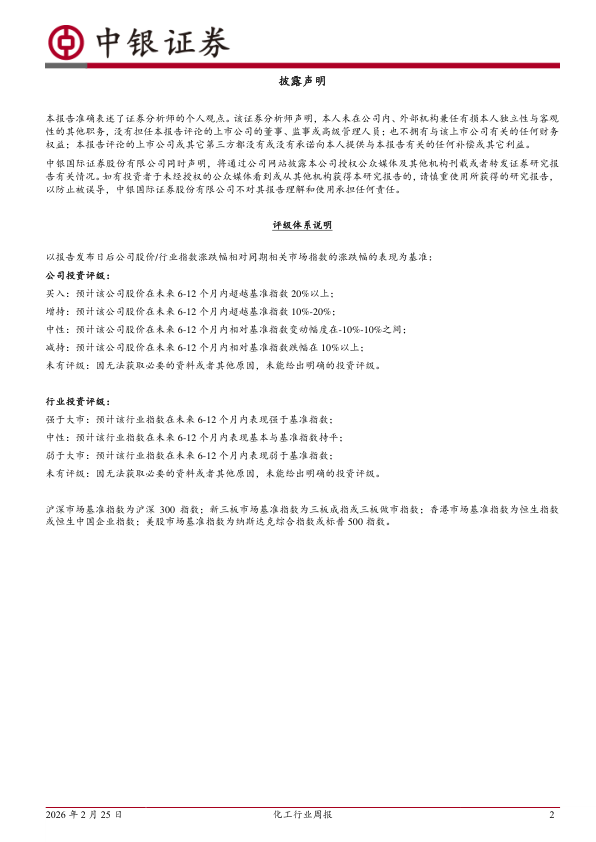 截至2月24日,SW基础化工市盈率(TTM剔除负值)为29.88倍,处在历史(2002年至今)85.25%分位数;市净率为2.69倍,处在历史78.35%分位数。SW石油石化市盈率(TTM剔除负值)为15.90倍,处在历史(2002年至今)48.79%分位数;市净率为1.54倍,处在历史53.69%分位数。展望2026年,本轮行业扩产已近尾声,“反内卷”等措施有望催化行业盈利底部修复同时新材料受益于下游需求的快速发展,有望开启新一轮高成长,二月份建议关注:1、低估值行业龙头公司;2、“反内卷”对相关子行业供给端影响;3、下游需求旺盛,自主可控日益关键背景下的电子材料公司。中长期推荐投资主线:1、传统化工龙头经营韧性凸显,布局新材料等领域竞争能力逆势提升,行业景气度好转背景下有望迎来业绩、估值双提升;2、“反内卷”等持续催化,关注供需格局持续向好子行业,包括炼化、聚酯、染料、有机硅、农药、制冷剂、磷化工等3、下游行业快速发展,新材料领域公司发展空间广阔。推荐:中国石油、中国海油、中国石化恒力石化、东方盛虹、桐昆股份、新凤鸣、浙江龙盛、兴发集团、扬农化工、利尔化学、联化科技、巨化股份、云天化、赛轮轮胎、安集科技、雅克科技、鼎龙股份、江丰电子、圣泉集团、东材科技、中材科技、沪硅产业、德邦科技、阳谷华泰、万润股份、莱特光电、蓝晓科技;建议关注:荣盛石化、上海石化、三房巷、万凯新材、恒逸石化、华润材料、新洋丰、中策橡胶、彤程新材、华特气体、联瑞新材、宏和科技、奥来德、瑞联新材、唯科科技等。