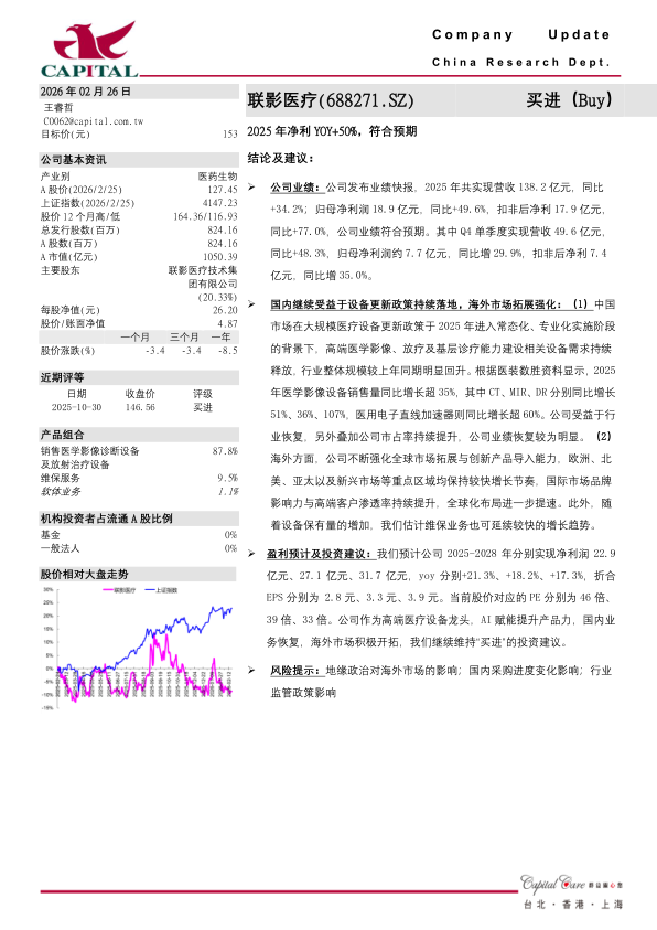 国内继续受益于设备更新政策持续落地,海外市场拓展强化:(1)中国市场在大规模医疗设备更新政策于2025年进入常态化、专业化实施阶段的背景下,高端医学影像、放疗及基层诊疗能力建设相关设备需求持续释放,行业整体规模较上年同期明显回升。根据医装数胜资料显示,2025年医学影像设备销售量同比增长超35%,其中CT、MIR、DR分别同比增长51%、36%、107%,医用电子直线加速器则同比增长超60%。公司受益于行业恢复,另外叠加公司市占率持续提升,公司业绩恢复较为明显。(2)海外方面,公司不断强化全球市场拓展与创新产品导入能力,欧洲、北美、亚太以及新兴市场等重点区域均保持较快增长节奏,国际市场品牌影响力与高端客户渗透率持续提升,全球化布局进一步提速。此外,随着设备保有量的增加,我们估计维保业务也可延续较快的增长趋势。