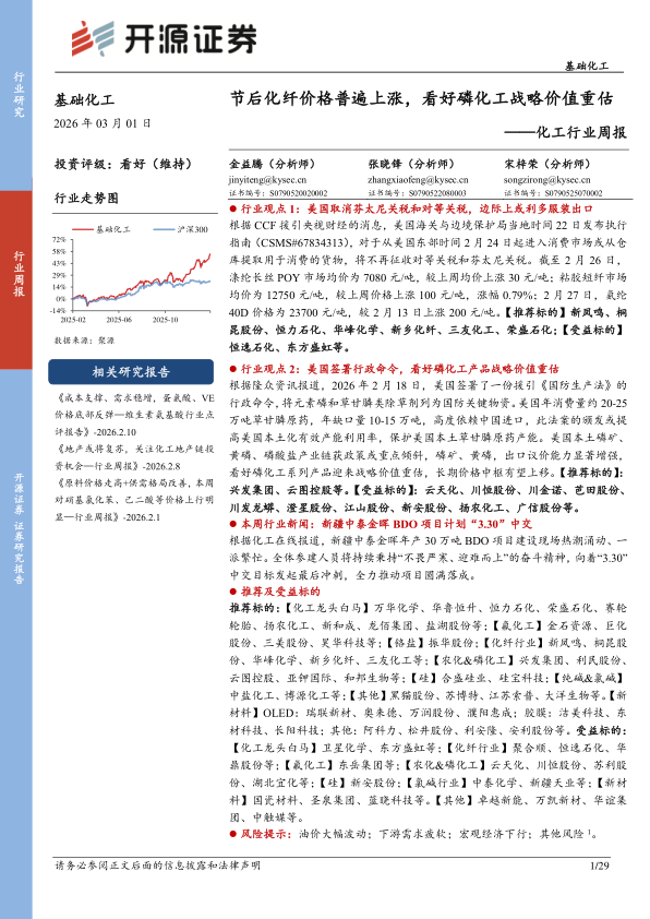 基础化工行业周报:节后化纤价格普遍上涨,看好磷化工战略价值重估