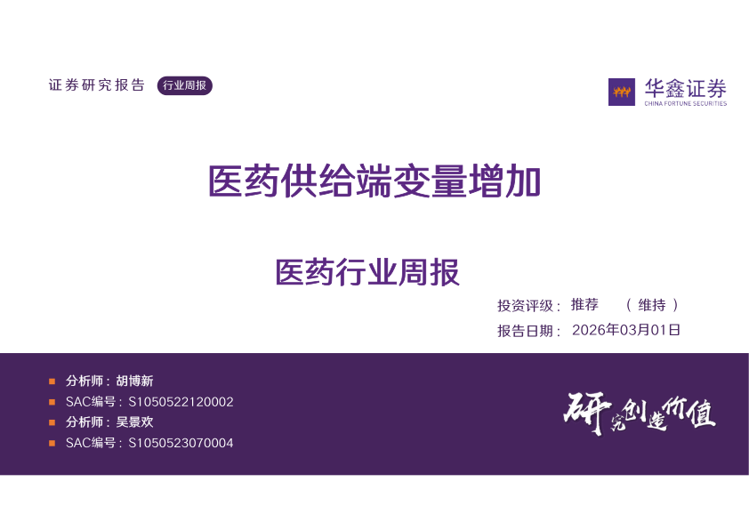 医药行业周报:医药供给端变量增加