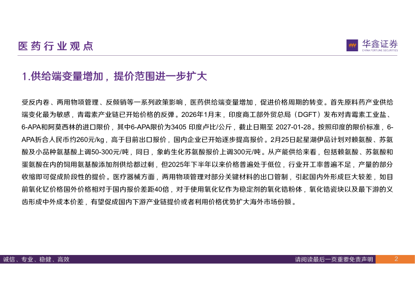 受反内卷、两用物项管理、反倾销等一系列政策影响,医药供给端变量增加,促进价格周期的转变。首先原料药产业供给端变化最为敏感,青霉素产业链已开始价格的反弹。2026年1月末,印度商工部外贸总局(DGFT)发布对青霉素工业盐、6-APA和阿莫西林的进口限价,其中6-APA限价为3405印度卢比/公斤,截止日期至2027-01-28。按照印度的限价标准,6-APA折合人民币约260元/kg,高于目前出口报价,国内企业已开始逐步提高报价。2月25日起星湖伊品计划对赖氨酸、苏氨酸及小品种氨基酸上调50-300元/吨,同日,象屿生化苏氨酸报价上调300元/吨。从产能供给来看,包括赖氨酸、苏氨酸和蛋氨酸在内的饲用氨基酸添加剂供给都过剩,但2025年下半年以来价格普遍处于低位,行业开工率普遍不足,产量的部分收缩即可促成阶段性的提价。医疗器械方面,两用物项管理对部分关键材料的出口管制,引起国内外形成巨大较差,如目前氧化钇价格国外价格相对于国内报价差距40倍,对于使用氧化钇作为稳定剂的氧化锆粉体,氧化锆瓷块以及最下游的义齿形成中外成本价差,有望促成国内下游产业链提价或者利用价格优势扩大海外市场份额。