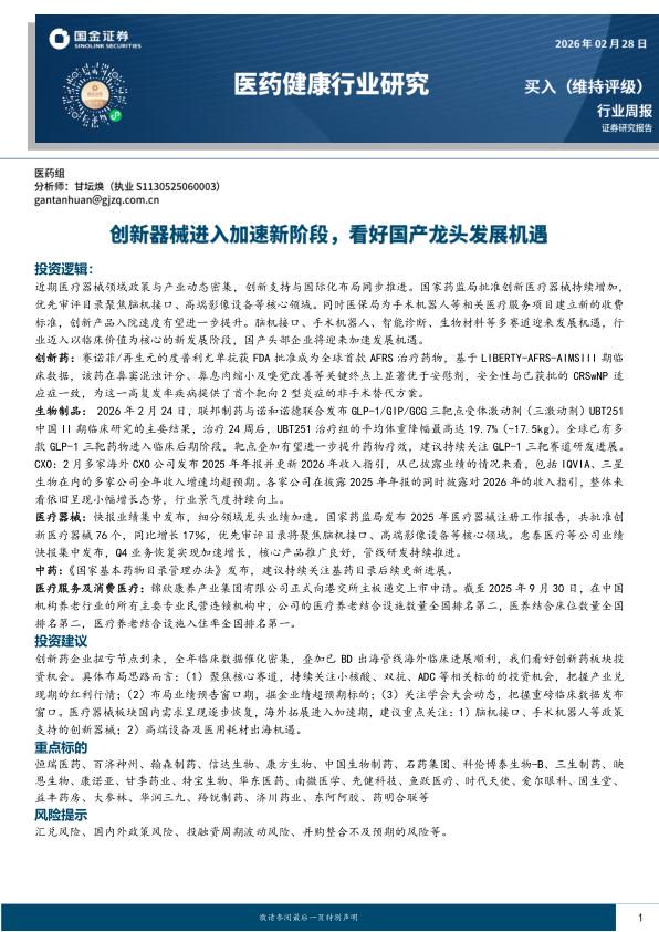 医疗器械:快报业绩集中发布,细分领域龙头业绩加速。国家药监局发布2025年医疗器械注册工作报告,共批准创新医疗器械76个,同比增长17%,优先审评目录将聚焦脑机接口、高端影像设备等核心领域。惠泰医疗等公司业绩快报集中发布,Q4业务恢复实现加速增长,核心产品推广良好,管线研发持续推进。