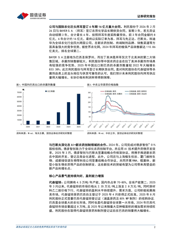 公司与国际农化巨头拜耳签订6年期16亿元重大合同。利民股份于2026年2月26日与BAYER S.A.(拜耳)签订农用化学品长期供货合同,首期3年,若无异议自动续期3年,合计最长6年。按照拜耳年度采购量预估,前3年合同金额约8亿元,6年合计约16亿元,最终以实际订单为准。拜耳与先正达、巴斯夫、科迪华为全球农化行业四大跨国公司,在新农药创制、终端制剂品牌、销售渠道等方面具备强大的竞争优势,据世界农化网,2024年拜耳的植保产品销售额达110.86亿美元,排名全球第二。
