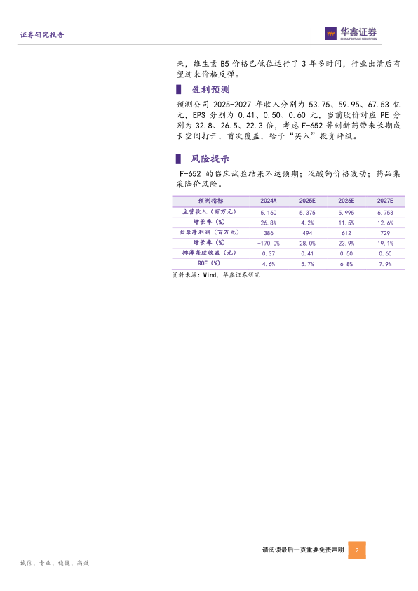 预测公司2025-2027年收入分别为53.75、59.95、67.53亿元,EPS分别为0.41、0.50、0.60元,当前股价对应PE分别为32.8、26.5、22.3倍,考虑F-652等创新药带来长期成长空间打开,首次覆盖,给予“买入”投资评级。