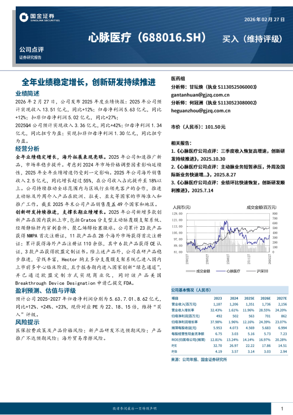 2026年2月27日,公司发布2025年度业绩快报:2025年公司预计实现收入13.51亿元,同比+12%;归母净利润5.63亿元,同比+12%;扣非归母净利润5.02亿元,同比+27%;