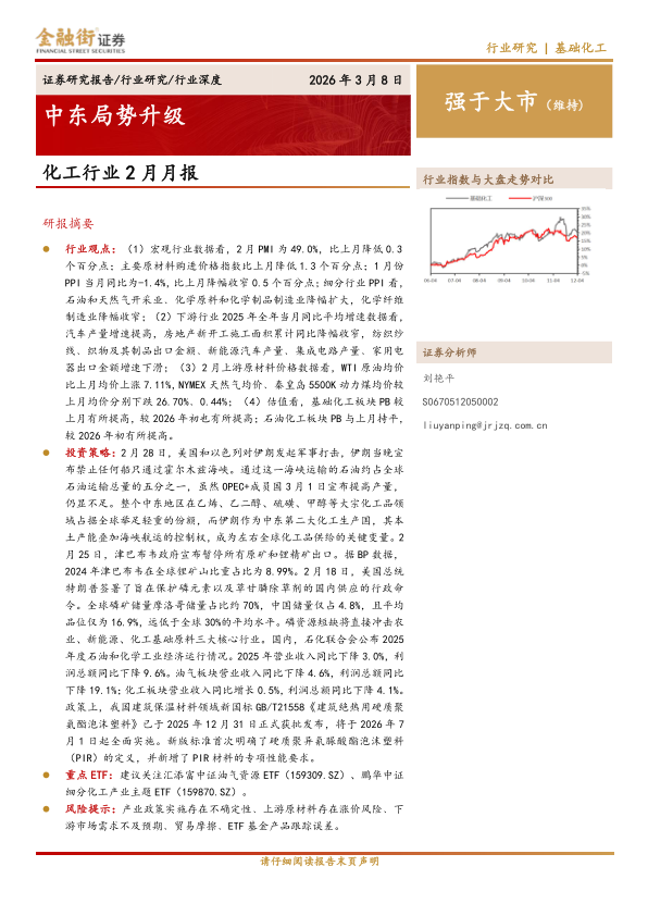 行业观点:(1)宏观行业数据看,2月PMI为49.0%,比上月降低0.3个百分点;主要原材料购进价格指数比上月降低1.3个百分点;1月份PPI当月同比为-1.4%,比上月降幅收窄0.5个百分点;细分行业PPI看,石油和天然气开采业﹑化学原料和化学制品制造业降幅扩大,化学纤维制造业降幅收窄;(2)下游行业2025年全年当月同比平均增速数据看,汽车产量增速提高,房地产新开工施工面积累计同比降幅收窄,纺织纱线﹑织物及其制品出口金额﹑新能源汽车产量﹑集成电路产量﹑家用电器出口金额增速下滑;(3)2月上游原材料价格数据看,WTI原油均价比上月均价上涨7.11%,NYMEX天然气均价﹑秦皇岛5500K动力煤均价较上月均价分别下跌26.70%﹑0.44%;(4)估值看,基础化工板块PB较上月有所提高,较2026年初也有所提高;石油化工板块PB与上月持平,较2026年初有所提高。