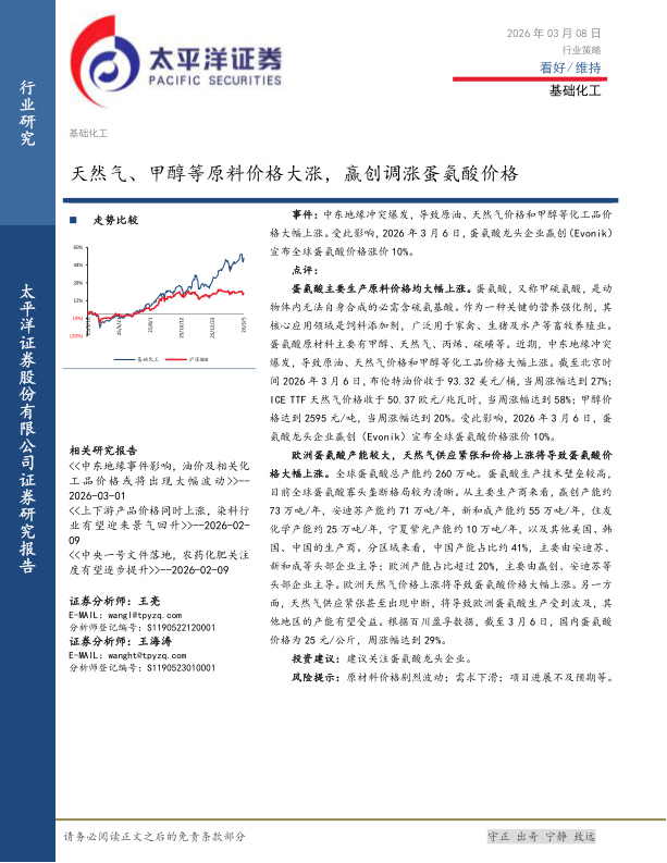 基础化工:天然气、甲醇等原料价格大涨,赢创调涨蛋氨酸价格