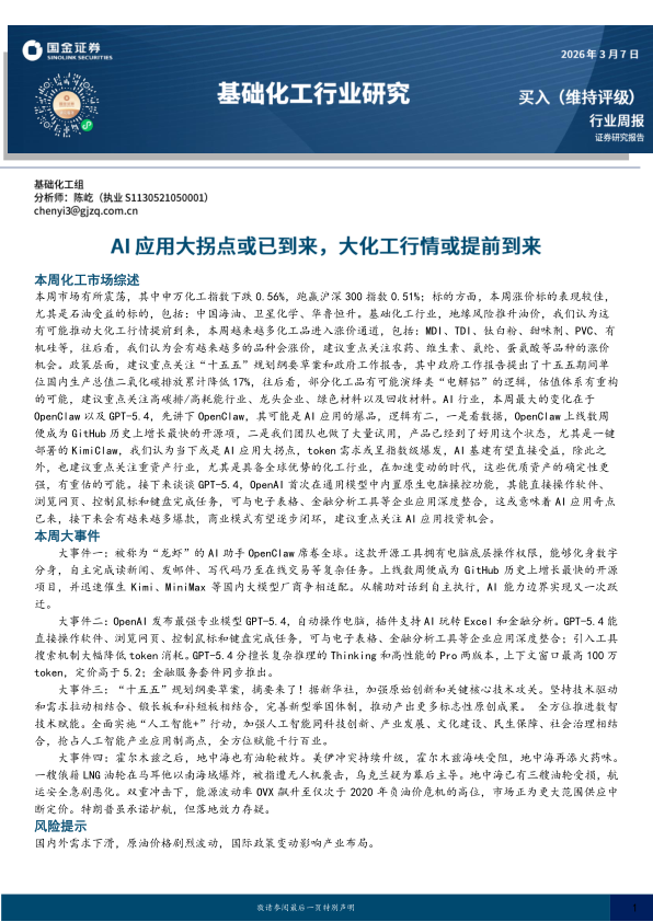 本周市场有所震荡,其中申万化工指数下跌0.56%,跑赢沪深300指数0.51%;标的方面,本周涨价标的表现较佳,尤其是石油受益的标的,包括:中国海油、卫星化学、华鲁恒升。基础化工行业,地缘风险推升油价,我们认为这有可能推动大化工行情提前到来,本周越来越多化工品进入涨价通道,包括:MDI、TDI、钛白粉、甜味剂、PVC、有机硅等,往后看,我们认为会有越来越多的品种会涨价,建议重点关注农药、维生素、氨纶、蛋氨酸等品种的涨价机会。政策层面,建议重点关注“十五五”规划纲要草案和政府工作报告,其中政府工作报告提出了十五五期间单位国内生产总值二氧化碳排放累计降低17%,往后看,部分化工品有可能演绎类“电解铝”的逻辑,估值体系有重构的可能,建议重点关注高碳排/高耗能行业、龙头企业、绿色材料以及回收材料。AI行业,本周最大的变化在于OpenClaw以及GPT-5.4,先讲下OpenClaw,其可能是AI应用的爆品,逻辑有二,一是看数据,OpenClaw上线数周便成为GitHub历史上增长最快的开源项,二是我们团队也做了大量试用,产品已经到了好用这个状态,尤其是一键部署的KimiClaw,我们认为当下或是AI应用大拐点,token需求或呈指数级爆发,AI基建有望直接受益,除此之外,也建议重点关注重资产行业,尤其是具备全球优势的化工行业,在加速变动的时代,这些优质资产的确定性更强,有重估的可能。接下来谈谈GPT-5.4,OpenAI首次在通用模型中内置原生电脑操控功能,其能直接操作软件、浏览网页、控制鼠标和键盘完成任务,可与电子表格、金融分析工具等企业应用深度整合,这或意味着AI应用奇点已来,接下来会有越来越多爆款,商业模式有望逐步闭环,建议重点关注AI应用投资机会。
