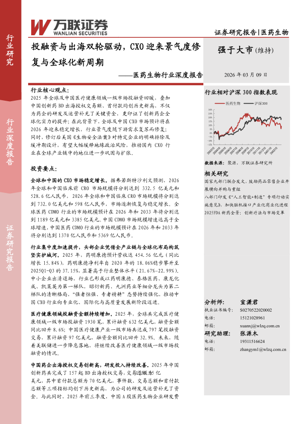 2025年全球及中国医疗健康领域一级市场投融资回暖,叠加中国创新药BD出海授权交易额、首付款均创历史新高,不仅为药企的研发及运营补充了关键资金,更印证了创新药企全球化实力的提升;在此背景下,全球及中国CXO市场预计将在2026年迎来稳定增长,行业景气度随下游需求复苏而修复;同时,修订后美国《生物安全法案》对特定企业的明确排除及缓冲期设计,有望大幅缓释地缘政治风险,推动国内CXO行业在全球产业链中的地位进一步巩固与扩张。