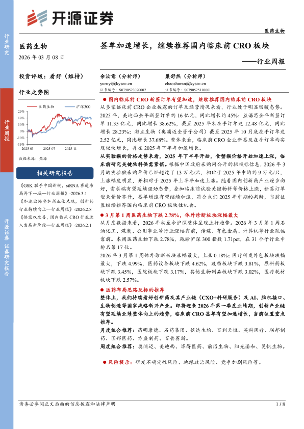 医药生物行业周报:签单加速增长,继续推荐国内临床前CRO板块