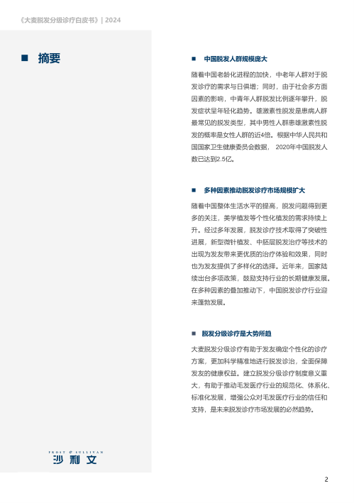 随着中国老龄化进程的加快,中老年人群对于脱发诊疗的需求与日俱增;同时,由于社会多方面因素的影响,中青年人群脱发比例逐年攀升,脱发症状呈年轻化趋势。雄激素性脱发是患病人群最常见的脱发类型,其中男性人群患雄激素性脱发的概率是女性人群的近4倍。根据中华人民共和国国家卫生健康委员会数据,2020年中国脱发人数已达到2.5亿。