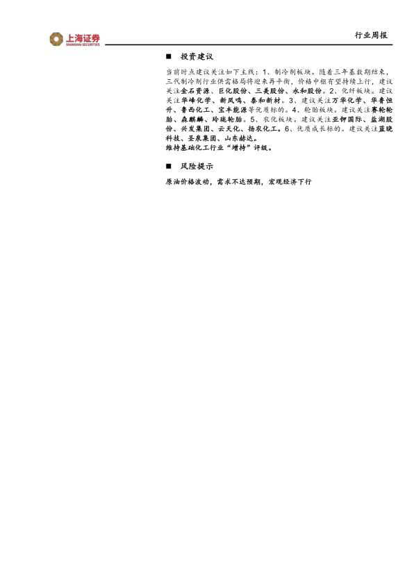 当前时点建议关注如下主线:1、制冷剂板块。随着三年基数期结束,三代制冷剂行业供需格局将迎来再平衡,价格中枢有望持续上行,建议关注金石资源、巨化股份、三美股份、永和股份。2、化纤板块。建议关注华峰化学、新凤鸣、泰和新材。3、建议关注万华化学、华鲁恒升、鲁西化工、宝丰能源等优质标的。4、轮胎板块。建议关注赛轮轮胎、森麒麟、玲珑轮胎。5、农化板块。建议关注亚钾国际、盐湖股份、兴发集团、云天化、扬农化工。6、优质成长标的。建议关注蓝晓科技、圣泉集团、山东赫达。