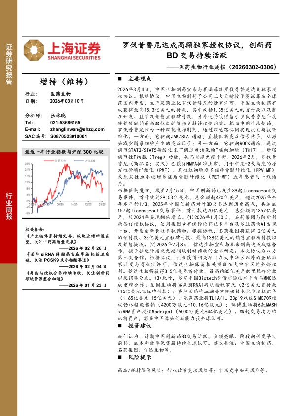 医药生物行业周报:罗伐昔替尼达成高额独家授权协议,创新药BD交易持续活跃