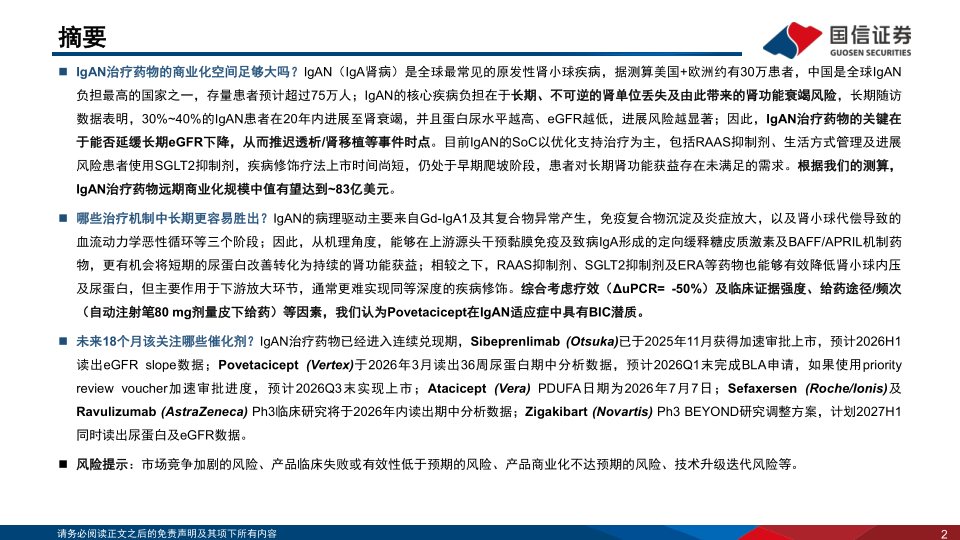 未来18个月该关注哪些催化剂?IgAN治疗药物已经进入连续兑现期,Sibeprenlimab(Otsuka)已于2025年11月获得加速审批上市,预计2026H1读出eGFR slope数据;Povetacicept(Vertex)于2026年3月读出36周尿蛋白期中分析数据,预计2026Q1末完成BLA申请,如果使用priorityreview voucher加速审批进度,预计2026Q3末实现上市;Atacicept(Vera)PDUFA日期为2026年7月7日;Sefaxersen(Roche/Ionis)及Ravulizumab(AstraZeneca)Ph3临床研究将于2026年内读出期中分析数据;Zigakibart(Novartis)Ph3BEYOND研究调整方案,计划2027H1同时读出尿蛋白及eGFR数据。
