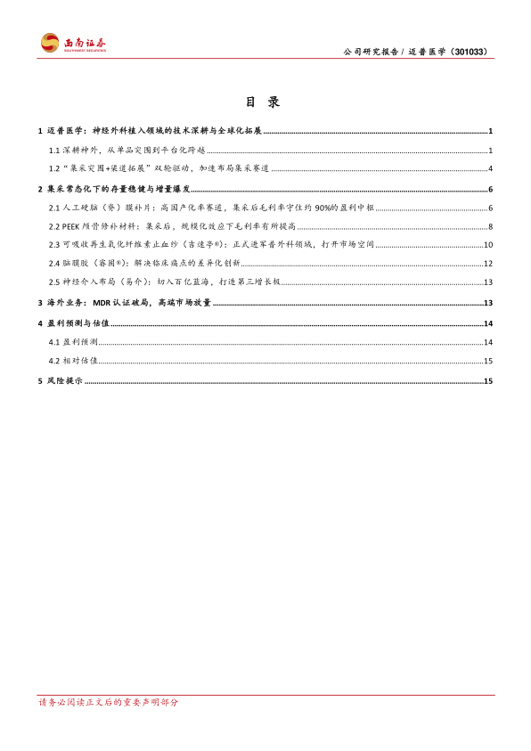 神经外科植入耗材的平台型龙头,具备“整体解决方案”的稀缺性。迈普医学是国内神经外科领域唯一能够同时提供人工硬脑(脊)膜补片、颅颌面修补固定系统、可吸收止血材料和硬脑膜医用胶等关键植入产品的企业。这种“一站式”产品组合为医院和经销商提供了极大的便利,构筑了强大的渠道壁垒和客户粘性。此外,公司在脑膜、PEEK材料、止血纱等产品经历多轮集采后,均实现了以量换价、市占率提升的良性增长。随着国内神经外科手术量因人口老龄化等因素持续增长,公司凭借其平台化优势和强大的政策应对能力,有望持续收割市场份额,实现长期稳健增长。