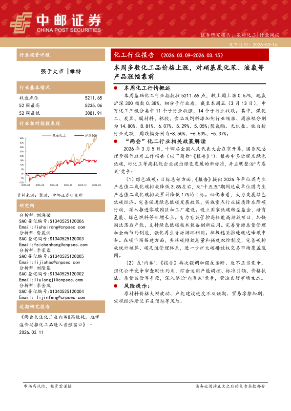 本周基础化工行业指数收5211.65点,较上周上涨0.57%,跑赢沪深300指数0.38%。细分子行业看,截至本周五(3月13日),申万化工三级分类中11个子行业收涨,14个子行业收跌。其中,煤化工、炭黑、膜材料、粘胶、食品及饲料添加剂行业领涨、周涨幅分别为14.80%、8.81%、6.07%、5.29%、5.05%;聚氨酯、无机盐、钛白粉行业走跌,周跌幅分别为-8.50%、-6.53%、-5.37%。