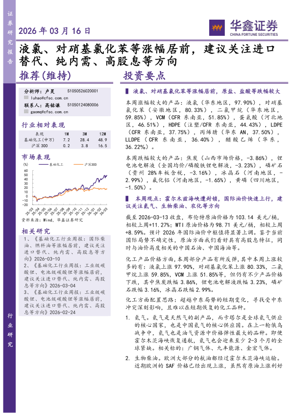 基础化工行业研究:液氯、对硝基氯化苯等涨幅居前,建议关注进口替代、纯内需、高股息等方向