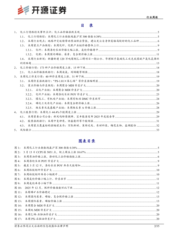 地缘冲突持续,原油价格上涨推动化工产品价格上涨。 据 Wind 数据,截至 3 月12 日,布伦特原油、 WTI 原油期货结算价分别为 100.46、 95.73 美元/桶,分别较3 月 5 日+18%、 +18%; 中国化工产品价格指数为 5,051 点,较 3 月 5 日+14%。原油供应紧张,下游化工品因原料供应不稳定,开工率难以提高,化工品价格近期呈现大幅波动的情况,其中涤纶长丝、聚酯瓶片、草甘膦、维生素、蛋氨酸等自身供需格局较好的产品价差涨幅较大。 涤纶长丝方面, 截至 3 月 12 日,涤纶长丝 POY 市场均价为 8900 元/吨,较上周均价上涨 1592 元/吨。本周国际油价大幅冲高,推动长丝市场价格大幅上涨, 同时 PX 受供应紧缺恐慌情绪拉动,期货盘面一度涨停,将聚酯产业链整体价格再度推高; 聚酯瓶片方面, 截至 3 月 12日,聚酯瓶片市场均价为 7990 元/吨,较上周同期价格+22.58%。原油走高,成本支撑强劲。叠加瓶片大厂缩减合约发货量,市场提货紧张,业者跟涨情绪高涨,瓶片实际商谈重心再次提升。 草甘膦方面, 截至 3 月 12 日, 95%草铵膦原粉市场均价为 4.85 万元/吨,较上周四价格+5.43%。需求良好,下游客户询单积极,按需采购,供应端排单充足,上调报价,新单成交价格走高。 维生素方面, 多数产品厂家停报, VA、 VE、 VD3 贸易渠道价格快速上涨。 蛋氨酸方面, 海外工厂发布不可抗力,固体蛋氨酸市价大幅上涨。 截至 3 月 12 日,固体蛋氨酸市场均价 31.5 元/公斤,较 3 月 5 日+46.5%。 推荐标的: 新凤鸣、 桐昆股份、 万凯新材、兴发集团、 江山股份、 扬农化工、 新和成。受益标的: 三房巷、华润材料、 新安股份、 和邦生物、 广信股份、 花园生物、 安迪苏等。