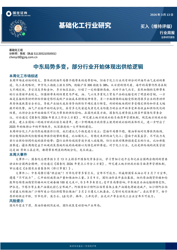 基础化工行业研究:中东局势多变,部分行业开始体现出供给逻辑