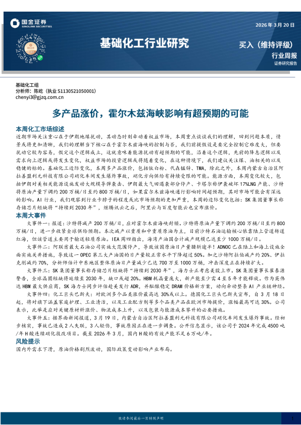 基础化工行业研究:多产品涨价,霍尔木兹海峡影响有超预期的可能