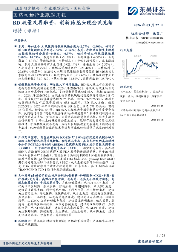 医药生物行业跟踪周报:BD放量及再融资,创新药龙头现金流充裕