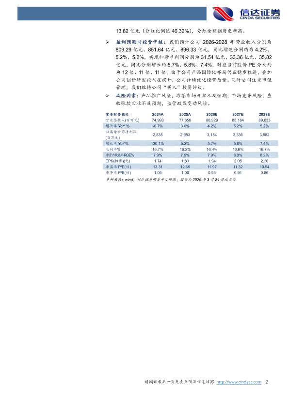 盈利预测与投资评级:我们预计公司2026-2028年营业收入分别为809.29亿元、851.64亿元、896.33亿元,同比增速分别约为4.2%、5.2%、5.2%,实现归母净利润分别为31.54亿元、33.36亿元、35.82亿元,同比分别增长约5.7%、5.8%、7.4%,对应当前股价PE分别约为12倍、11倍、11倍。由于公司产品国际化布局仍在稳步推进,叠加公司创新研发投入在提升,公司持续优化经营质量,同时公司注重市值管理,我们维持公司“买入”投资评级。