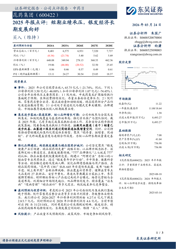 盈利预测与投资评级:考虑到公司2025年公司面临院内集采执行落地晚于预期,院外零售药店整合出清等多方面不利因素,导致整体业绩承压,我们将公司2026-2027年归母净利润预测由6.2/7.4亿元下调至2.8/3.7亿元,同时预测公司2028年归母净利润为4.6亿元,当前市值对应PE为31/23/18X.。同时考虑到公司长期规划明确,银发经济、精品国药战略布局持续深化,长期发展空间向好,维持“买入”评级。