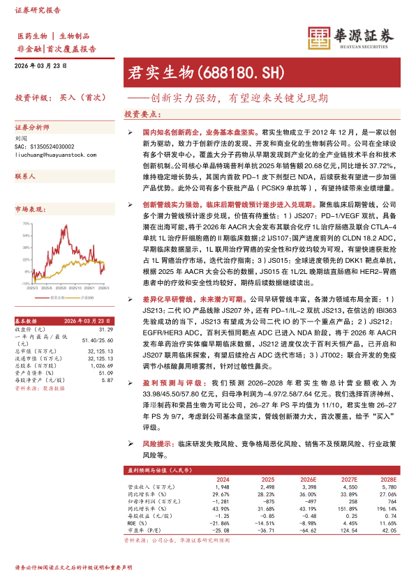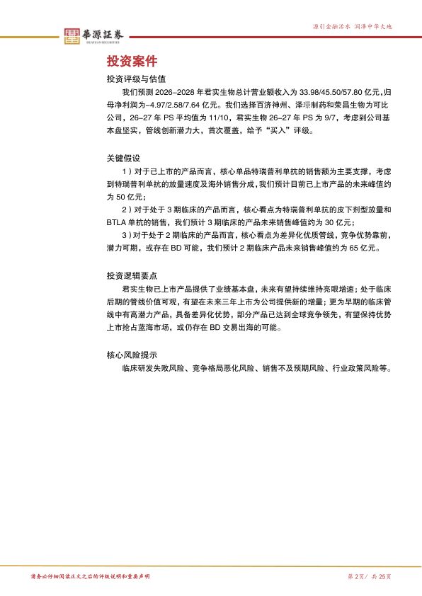 泽璟制药和荣昌生物为可比公司,26-27年PS平均值为11/10,君实生物26-27年PS为9/7,考虑到公司基本盘坚实,管线创新潜力大,首次覆盖,给予“买入”评级。