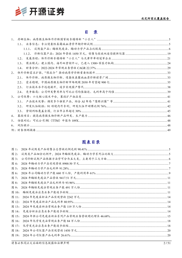 丹娜生物成立于2014年3月,专注于侵袭性真菌病血清学早期诊断及其他病原微生物体外诊断产品的研发、生产和销售,是国家高新技术企业、专精特新“小巨人”企业。公司产品主要为试剂和诊断仪器,2024年试剂营收占比90.41%。2022年,公司在中国侵袭性真菌病诊断试剂市场份额约30%,截至2025年6月末,试剂产品进入全国1300多家医疗机构,其中三级医院超千家。业绩方面,以2025年业绩数据快报计算,公司2017-2025年总营收CAGR为25.28%,常规业务2022-2024呈现逐年增长态势,CAGR为22.37%。2024年营收2.40亿元,毛利率85.75%、净利率36.39%。我们预计公司2025-2027年归母净利润为0.97/1.18/1.41亿元,EPS为1.74/2.13/2.55元/股,对应当前股价的PE分别为35.7/29.2/24.4倍。考虑到公司募投放量与研发潜力,公司业绩具备上涨空间,首次覆盖给予“增持”评级