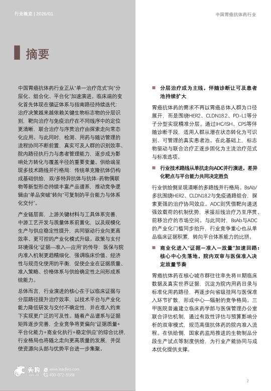 中国胃癌抗体药行业正从“单一治疗范式”向“分层化、组合化、平台化”加速演进。临床端的变化首先体现在循证体系与指南路径持续迭代:治疗决策越来越依赖关键生物标志物的分层识别,靶向治疗与免疫治疗在不同线序中的定位更清晰,联合治疗与序贯治疗由探索走向常态化应用。与此同时,检测、用药与随访管理的流程协同不断前置,真实可及人群的识别效率、院内路径执行力与患者管理能力,逐步成为影响处方转化与覆盖半径的重要变量。供给端呈现多技术路线并行格局:传统单克隆抗体仍构成基础供给,双/多特异抗体与抗体-药物偶联物等新型形态持续丰富产品谱系,推动竞争逻辑由“单品突破”转向“可复制的平台能力与体系化交付”。