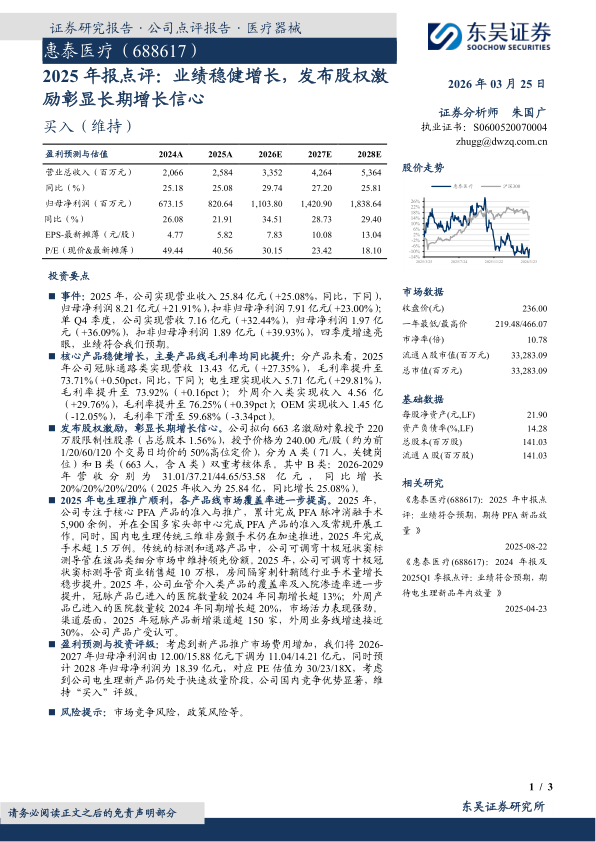 盈利预测与投资评级:考虑到新产品推广市场费用增加,我们将2026-2027年归母净利润由12.00/15.88亿元下调为11.04/14.21亿元,同时预计2028年归母净利润为18.39亿元,对应PE估值为30/23/18X,考虑到公司电生理新产品仍处于快速放量阶段,公司国内竞争优势显著,维持“买入”评级。
