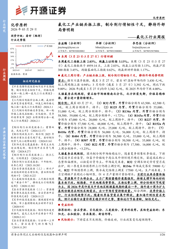 氟化工周行情:产业链共振上涨,制冷剂行情韧性十足,静待外部局势明朗萤石:据百川盈孚数据,截至3月27日,萤石97湿粉市场均价3,430元/吨,较上周同期上涨0.94%;3月均价(截至3月27日)3,392元/吨,同比下跌9.00%;2026年(截至3月27日)均价3,342元/吨,较2025年均价下跌4.00%。又据氟务在线跟踪,萤石粉市场继续南北分化,北方供需失衡,价格易稳难涨,蒙古进口量持续增长。