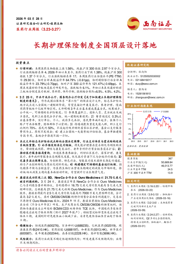 本次文件标志长护险由试点转向全国法定保障,行业支付体系与需求结构迎来系统性重塑。1)补齐银发经济支付短板,将失能护理潜在需求转化为刚性购买力,带动慢病用药、神经与康复类治疗、老年专科诊疗等全链条需求扩容;2)推动医疗服务格局重构,加速医养康养融合,利好社区医疗、居家护理、康复医疗、老年病科等服务业态规模化发展,优化医疗资源下沉与分级诊疗格局;3)完善多层次保障生态,为创新药、特色疗法、智能医疗技术提供长期支付通道助力产业创新转化与商业化闭环形成;4)构建稳定可持续的基金运行机制,强化精算平衡与全程监管,为医药生物行业营造长期确定的政策与市场环境,推动板块从政策主题向基本面驱动升级,有望提升行业长期景气度。